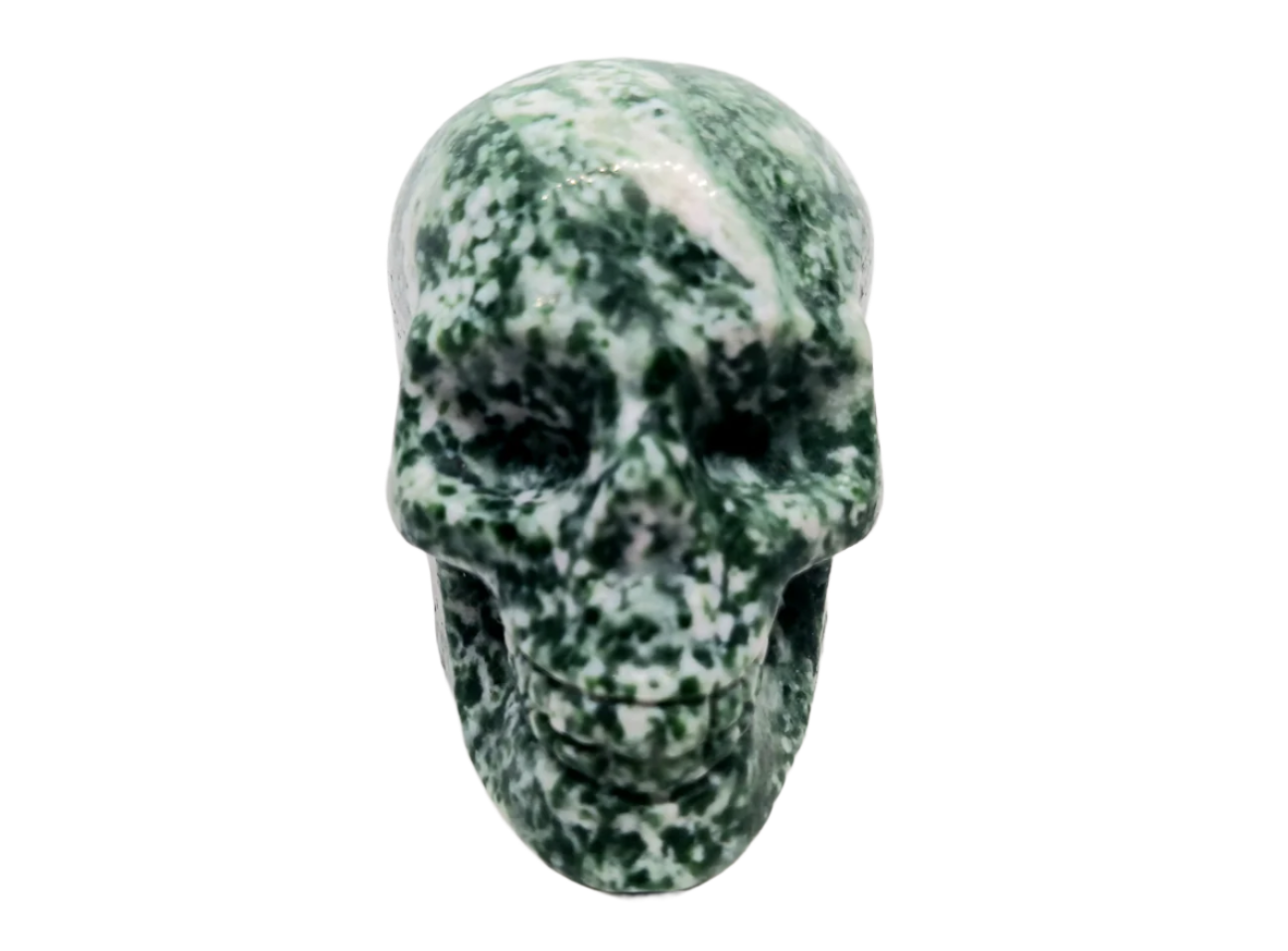 The hand-carved 2.5-inch Tree Agate crystal skull, weighing 217 grams, showcases the unique and intricate patterns that characterize tree agate, featuring earthy greens and whites that evoke the feeling of nature. The skull design adds a mystical touch, making it an attractive piece for collectors or as a decorative item. Its smooth finish and detailed craftsmanship highlight the artisan's skill, while the crystal is believed to promote tranquility and grounding energy, adding a spiritual dimension to its physical beauty.