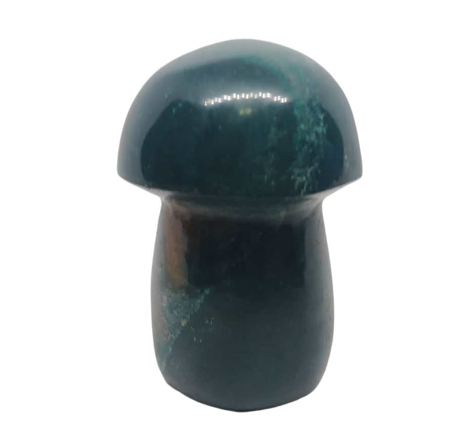The 219G Ocean Jasper crystal mushroom carving stands at 2.25 inches tall and features the unique, swirling patterns and vibrant colors characteristic of Ocean Jasper, which may include greens, blues, and creamy whites. This handmade piece showcases skilled craftsmanship and a polished finish, highlighting the stone's natural beauty and intricate designs. Ideal for collectors or as a decorative accent, the mushroom shape symbolizes growth and nurturing energy, making it a meaningful addition to any crystal collection.