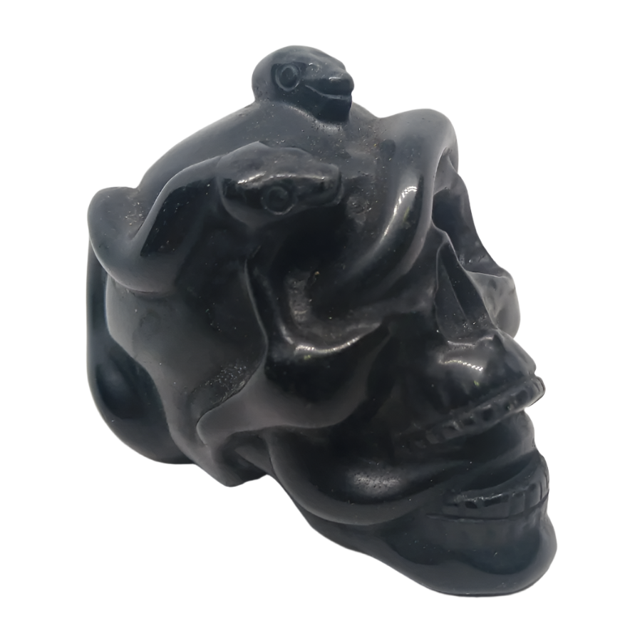 The hand-carved 287G Obsidian Crystal Medusa Skull is a striking piece of art, featuring intricate details that evoke the mythical allure of Medusa. Crafted from deep black obsidian, this skull showcases a polished surface that highlights the natural sheen of the stone, while the artistic mastery reveals features like serpentine motifs swirling throughout the design, symbolizing Medusa's legendary hair. Weighing 287 grams, it stands out as a captivating decorative item or a unique collector's piece, combining both spiritual significance and aesthetic appeal attributed to obsidian, such as protection and grounding properties.