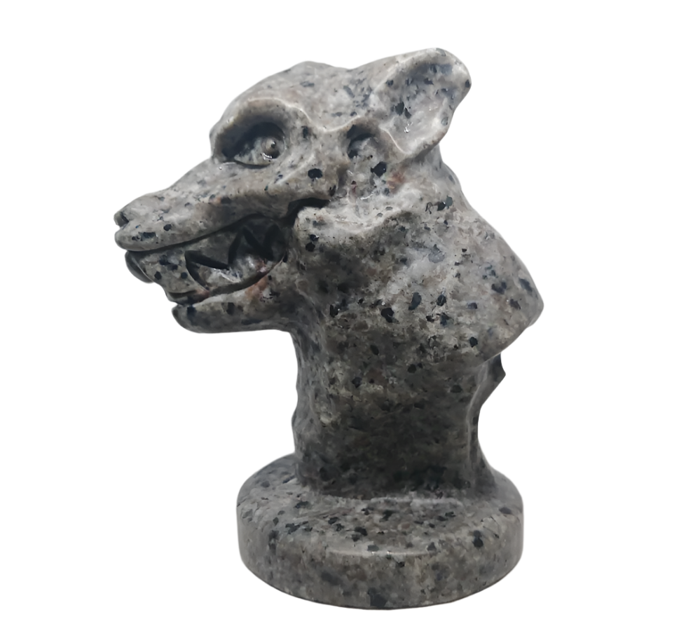 The hand-carved 3.2 lbs Yooperlite Crystal Werewolf Head stands at 8 inches tall, showcasing a striking blend of artistry and material. Made from Yooperlite, a unique rock that fluoresces under UV light due to its high spodumene content, this sculpture features intricate detailing that highlights the fierce expression and textured fur of the werewolf, capturing its mythical essence. The luminous qualities of the Yooperlite add an enchanting glow, making it a captivating decorative piece for collectors and enthusiasts alike.