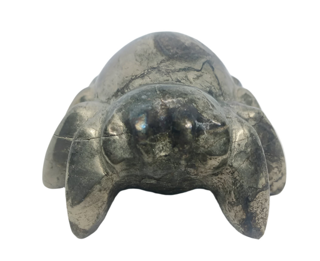 The 489G Pyrite Crystal Spider is a stunning hand-carved decorative piece made from pyrite, often referred to as "fool's gold" due to its metallic luster and brassy yellow hue. This intricately designed spider showcases detailed features, including textured legs and a shapely body, emphasizing the carver's craftsmanship. The natural crystal structure of pyrite adds a captivating depth and shine, making it not only a unique artistic piece but also a symbol of prosperity and protection in crystal healing practices.