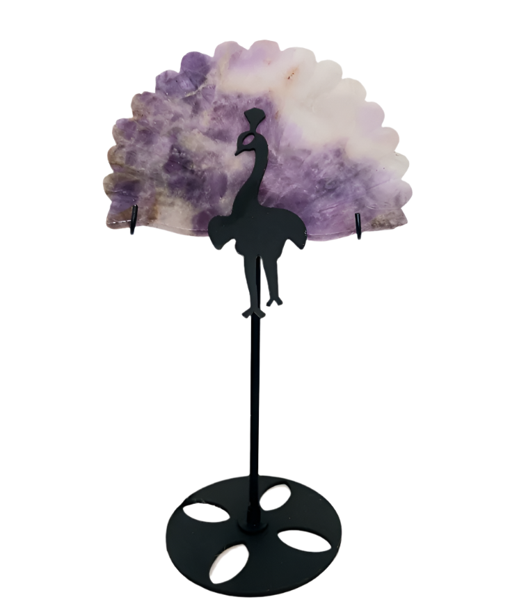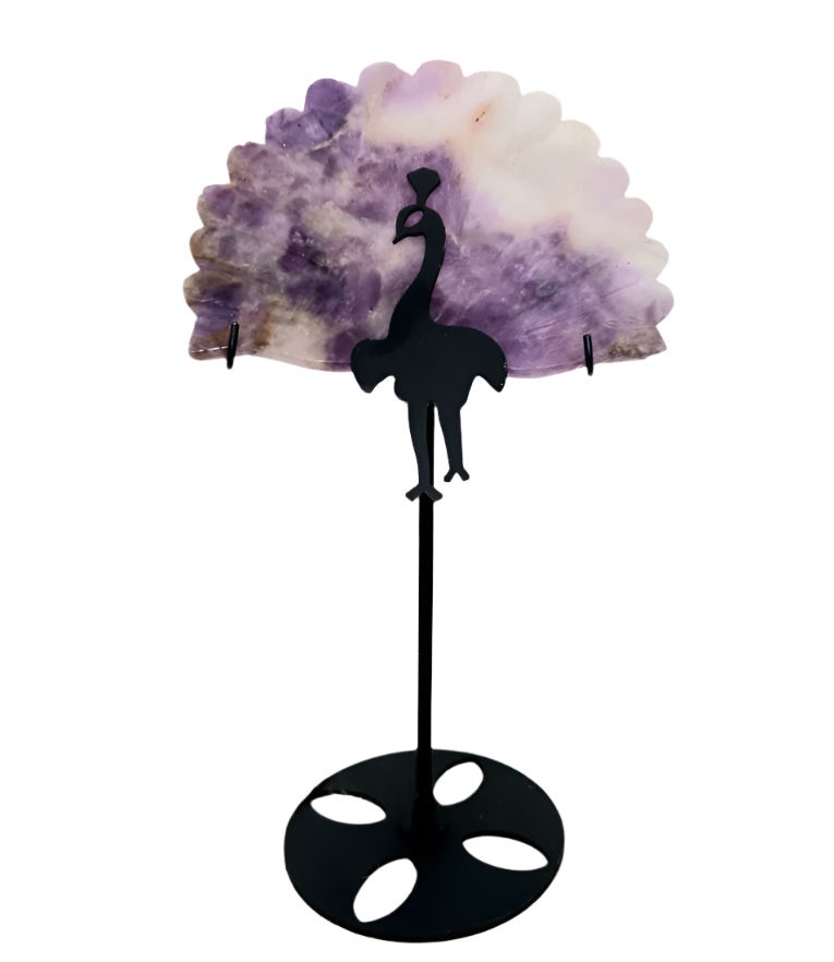 The hand-carved 5.75-inch Dream Amethyst Crystal Peacock Wings are stunning decorative pieces that showcase intricate craftsmanship and the enchanting beauty of amethyst. Each wing is meticulously carved to resemble the graceful silhouette of peacock wings, featuring rich purple hues and natural variations that reflect the stone's unique qualities. The display stand complements the wings perfectly, allowing them to be showcased prominently while adding a touch of elegance to any decor. Ideal for collectors or as a striking centerpiece, these pieces embody both artistic expression and the calming energy associated with amethyst.