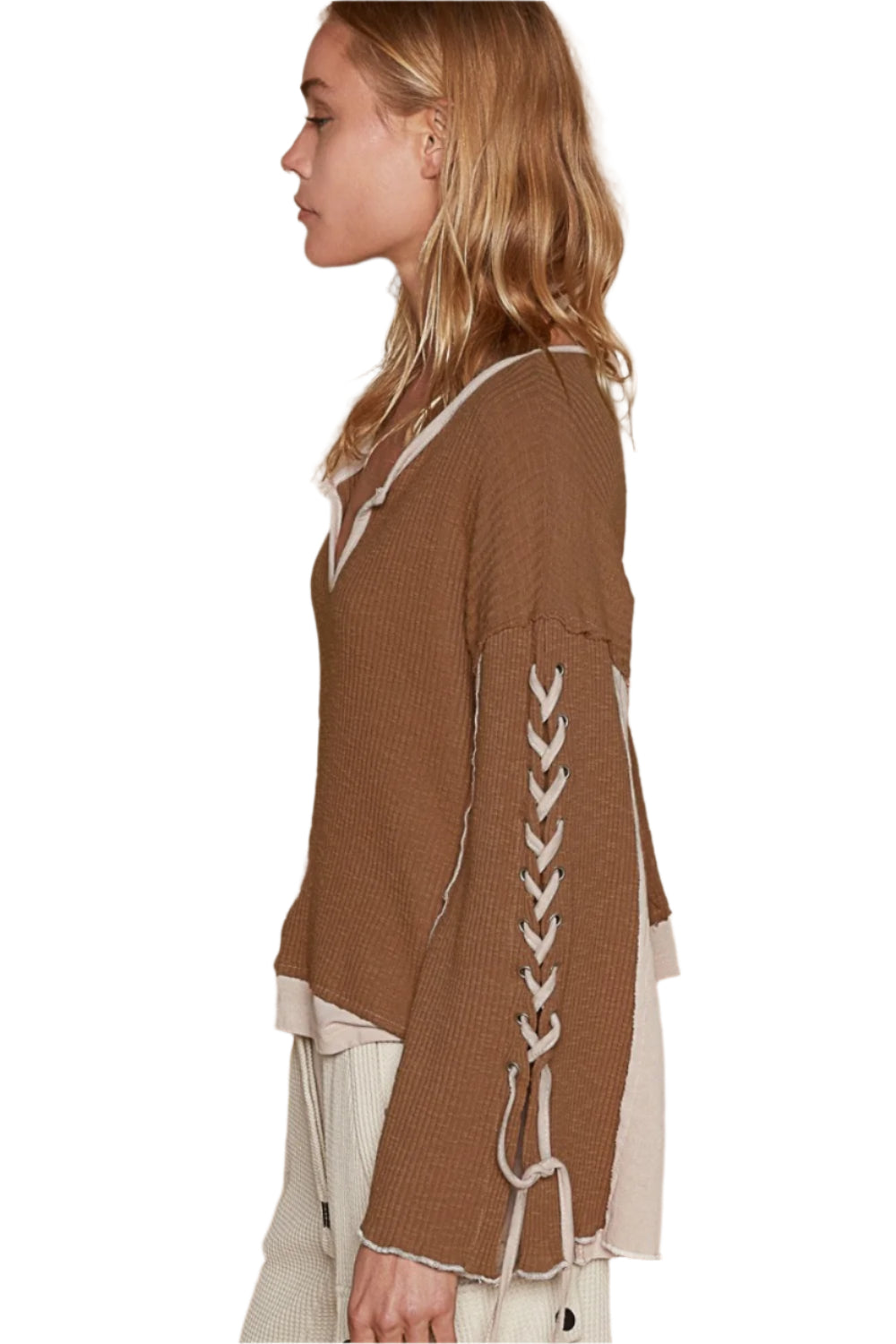 The Lace-Up Sleeve Color Block Ribbed Knit Top is a trendy and eye-catching piece for your wardrobe. Featuring a notched neck and long sleeves with lace-up details, this top exudes a stylish and edgy vibe. The oversized fit and ribbed knit construction offer both comfort and a modern aesthetic. With contrasting color block panels, this top is a chic and versatile option for adding a pop of style to your outfits. Stay on-trend and elevate your look with this unique and fashion-forward ribbed knit top.