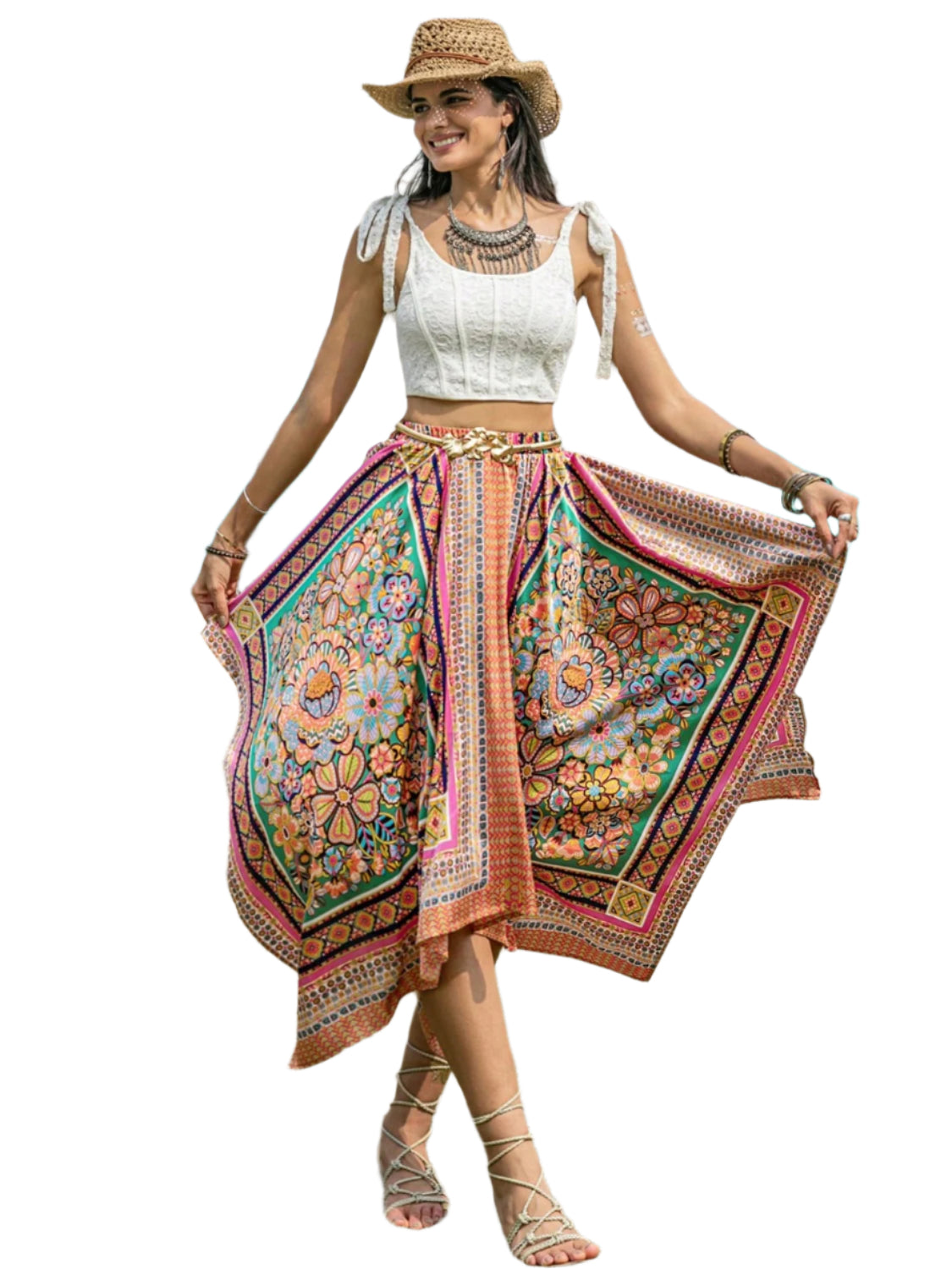 Printed High Waist Handkerchief Hem Skirt