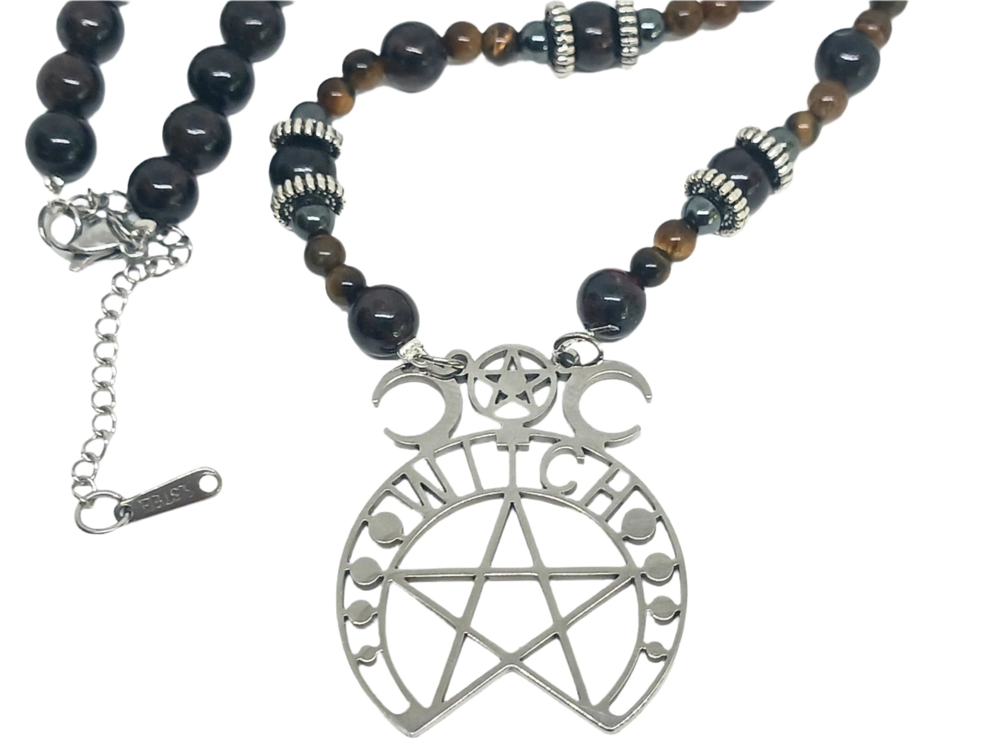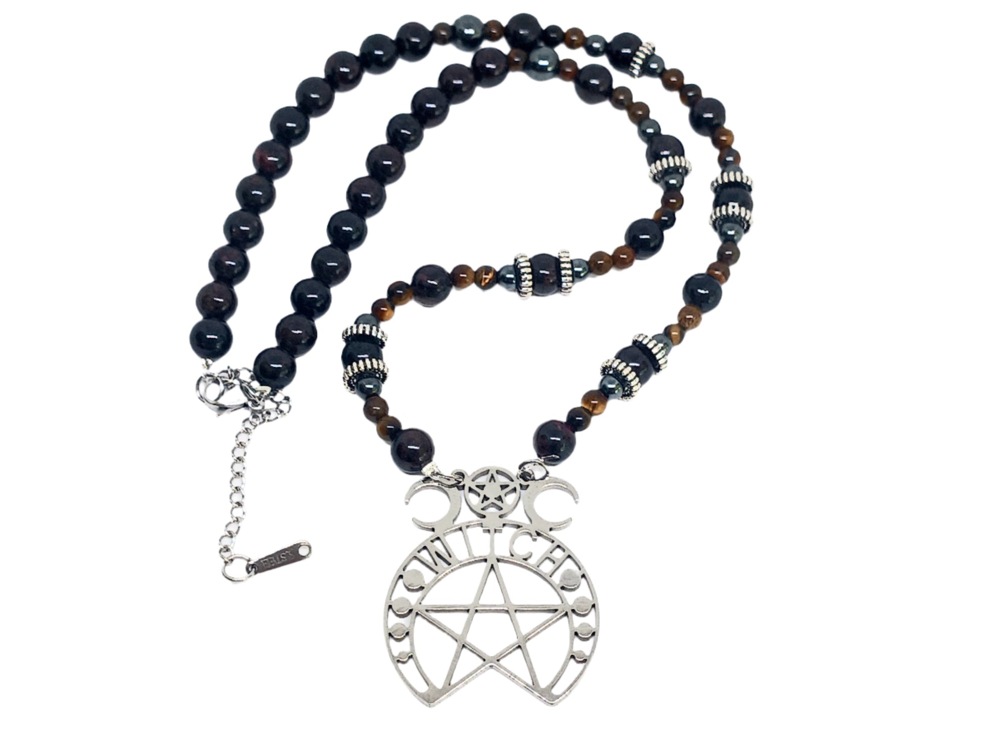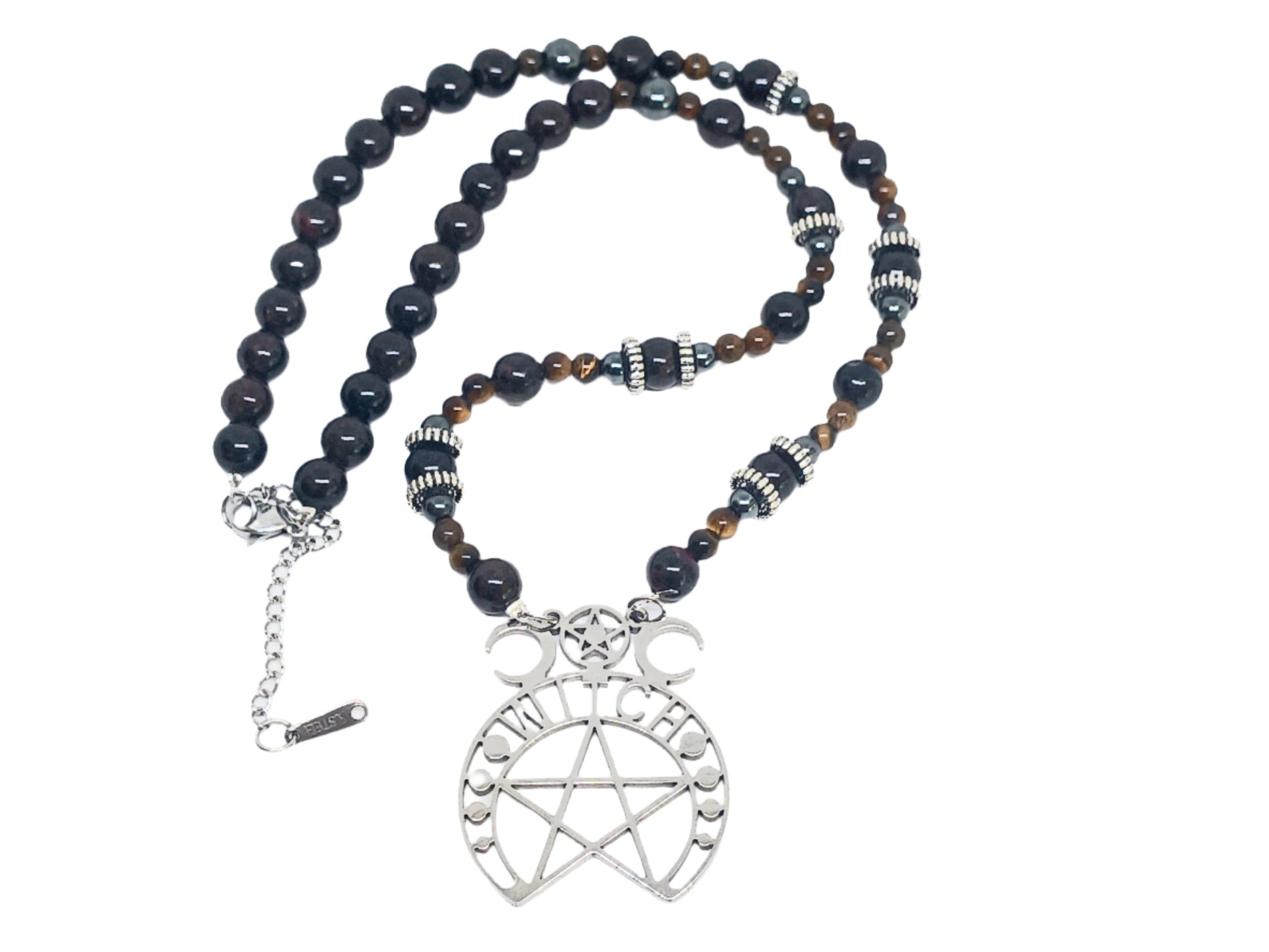 Stainless Steel Witch Pendant Necklace with Garnet and Tiger Eye Crystal
